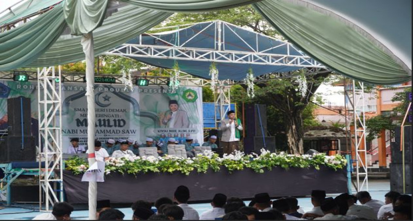 Sambutan hangat dari kepala SMA Negeri 1 Demak, Solikhin, S.Pd., M.Pd menandai dimulainya acara. Melalui pesannya, beliau menekankan pentingnya meneladani akhlak Rasulullah sebagai fondasi moral generasi muda Smansade. Sambutan itu disambut tepuk tangan meriah, lalu perhatian pun beralih ke depan panggung. Tim ekstra rebana tampil membawakan tabuhan dan tari kreasi penuh energi. Alunan rebana yang ritmis, gerakan yang luwes, serta sorak-sorai peserta membuat suasana lapangan semakin hidup.