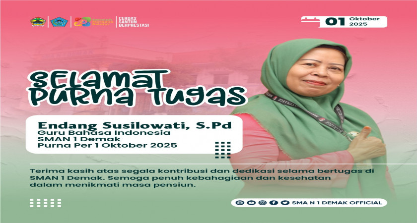 Rabu (01/10/2025) siang, di aula SMA Negeri 1 Demak, terjadi momen haru. Pada hari itu, sekolah melepas salah satu pendidik kenyang pengalamannya, Endang Susilowati, S.Pd sebagai guru mata pelajaran Bahasa Indonesia yang mengabdi dengan setia selama belasan tahun di Smansade. Bu Endang, begitu sapaan akrabnya dikenal sebagai guru yang sudah banyak memiliki pengalaman dalam mengajar Bahasa Indonesia kepada siswa-siswi.