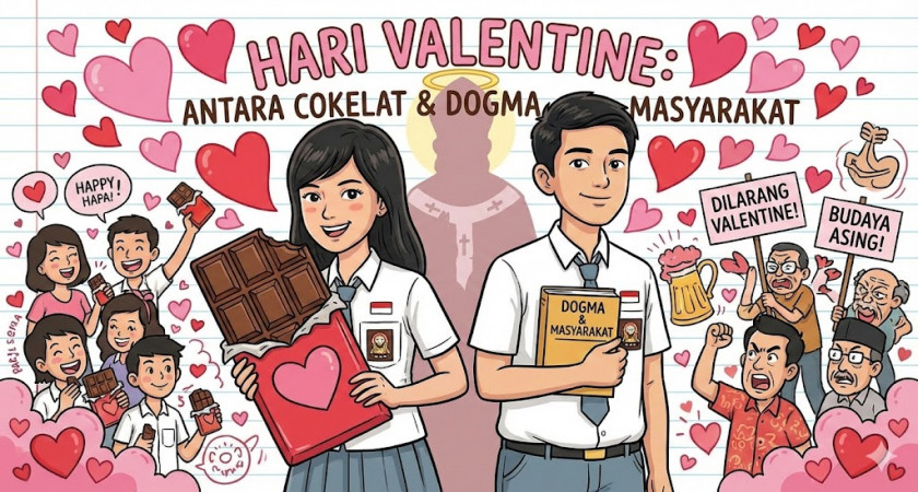 Aku diam sejenak, berpikir untuk membeli coklat dari promosi OSIS. Jika berharap coklat yang kubeli itu untuk orang lain maka nilaimu untuk berharap adalah nol. Tentu aku akan memakannya sendiri. Salah satu guruku bilang tidak boleh merayakan hari Valentine, sama halnya dengan keluargaku dan aku bertanya dalam hati, “mengapa tidak?”. Padahal, inti ajaran agama juga menempatkan cinta sebagai nilai luhur: kasih sayang pada sesama, keluarga, dan kemanusiaan..
